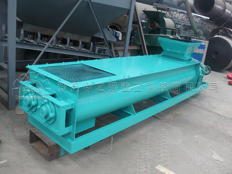 The double axis mixer is rotated through two groups of screw shafts with spiral blade, and water is added water to the powder material for spraying wet mixing transportation, so that powdery material can achieve controllable humidity. The equipment is mainly suitable for humidification and mixing of raw materials in the fertilizer industry, so that the materials are fully mixing and this machine have the function of conveying too. When the quantity of raw material is poured into the mixing tank from the outlet, the raw material is atomized by a number of water with relative pressure, which is stirred by the mixing shaft of the qualitative length to form a uniform water-containing core. The whole agitation is divided into three areas: atomization area, mixing area and discharge area. The agitator leaves have well wear resistance and long service life.